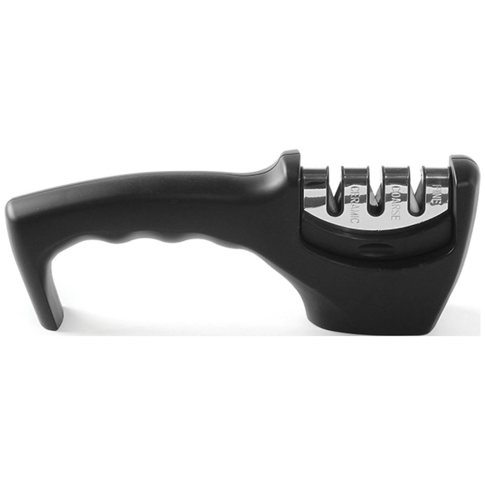 Ακονιστήρι μαχαιριών. Εργονομική λαβή και αντιολισθητική βάση για ασφάλεια και άνεση. Τριπλή λειτουργία για ακόνισμα κάθε είδους μαχαιριών, ακόμη και κεραμικών. Αρχικό στάδιο: ο ακονιστής καρβιδίου εξασφαλίζει ακρίβεια κάθε φορά που κόβετε. Φινίρισμα: διασταυρούμενες κεραμικές ράβδοι για τέλεια λεπίδα επαγγελματικής χρήσης. Κεραμικά μαχαίρια: διασταυρούμενες κεραμικές ράβδοι για κεραμικά μαχαίρια. Να μην χρησιμοποιείται για να ακονίζονται πριονωτά μαχαίρια ή ψαλίδια.
