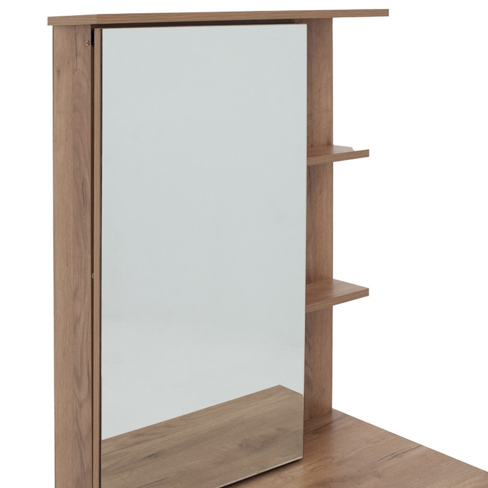 Η τουαλέτα κρεβατοκάμαρας Zelia είναι μια κομψή και πρακτική προσθήκη στον χώρο σας. Διαθέτει συρόμενο καθρέπτη με αποθηκευτικό χώρο από πίσω, όπου μπορείτε να τοποθετήσετε διάφορα αντικείμενα όπως κοσμήματα, αρώματα και άλλα προσωπικά αξεσουάρ. Τα ραφάκια στο πλάι της κονσόλας καθώς και ένα συρτάρι που διαθέτει σας προσθέτουν επιπλέον αποθηκευτικό χώρο και σας επιτρέπουν να αποθηκεύσετε προσωπικά αντικείμενα με ασφάλεια και οργάνωση. Το συμπεριλαμβανόμενο σκαμπό σας παρέχει μια άνετη και λειτουργική θέση για να κάθεστε κατά την προετοιμασία σας. Ανανεώστε την αισθητική και την οργάνωση του χώρου σας με αυτήν την κομψή και πρακτική κονσόλα.