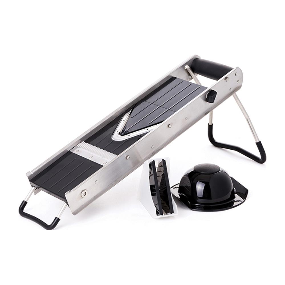 Μαντολίνο τύπου V με διπλή λεπίδα. Από ανοξείδωτο ατσάλι και μαύρο ABS. Κύρια λεπίδα κοπής σχήματος V, κυματιστή δευτερεύουσα λεπίδα κοπής σε φέτες. Το πάχος κοπής φέτας ρυθμίζεται εύκολα και στις δύο λεπίδες. Βάση που διπλώνει με λαστιχένια πόδια. Περιλαμβάνονται δύο επιπλέον λεπίδες για κοπή julienne ή πατάτες τηγανιτές, πάχους 6 ή 9mm. Περιλαμβάνεται κουτί αποθήκευσης για ασφαλή φύλαξη των λεπίδων. Θήκη προϊόντος από πολυπροπυλένιο με μεταλλικές καρφίδες.