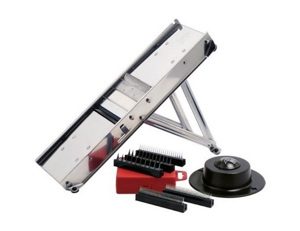 Βαριά ανοξείδωτη κατασκευή με πλαστική λαβή λαχανικών. Πρακτικό και ευέλικτο υποστήριγμα Εναλλάξιμα μαχαίρια julienne και ράβδος 1-2-4-7-10mm Ρυθμιζόμενο πάχος κοπής σε φέτες και wafer