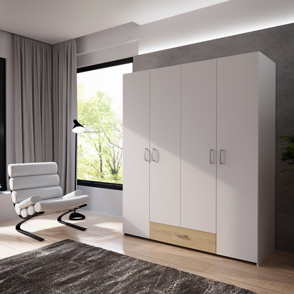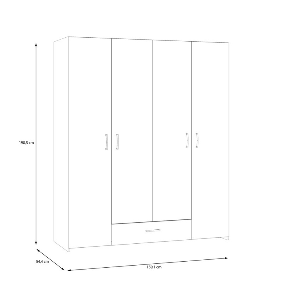 Περιλαμβάνει τέσσερις μεγάλες πόρτες, εσωτερικά φέρει ράγες για κρεμάστρες και κάτω ένα συρτάρι για την αποθήκευση ρούχων και αξεσουάρ.