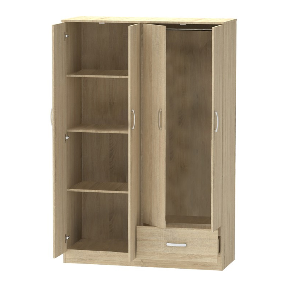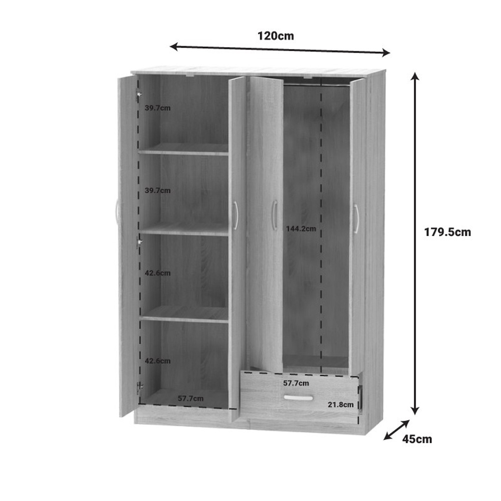 * Περιλαμβάνει τέσσερις πόρτες για αποθήκευση. Οι δύο πόρτες δεξιά, στο εσωτερικό τους διαθέτουν ράγα για κρεμάστρες.Οι δύο μεγαλύτερες πόρτες διαθέτουν στο εσωτερικό τους τέσσερα ράφια. Στο κάτω μέρος φέρει ένα συρόμενο συρτάρι για την αποθήκευση ρούχων και αξεσουάρ.