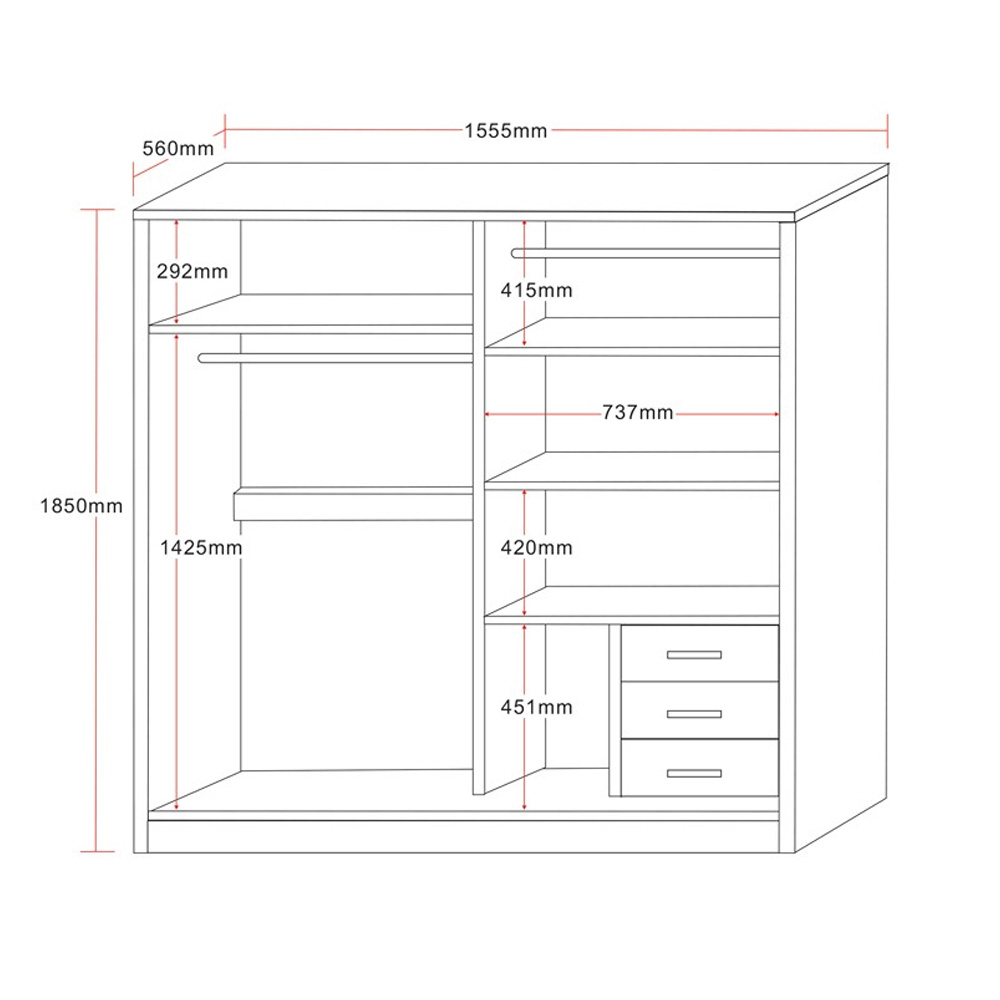 Στο εσωτερικό περιλαμβάνει βέργα για κρεμάστρες και τρία ράφια καθώς και τρία συρτάρια.