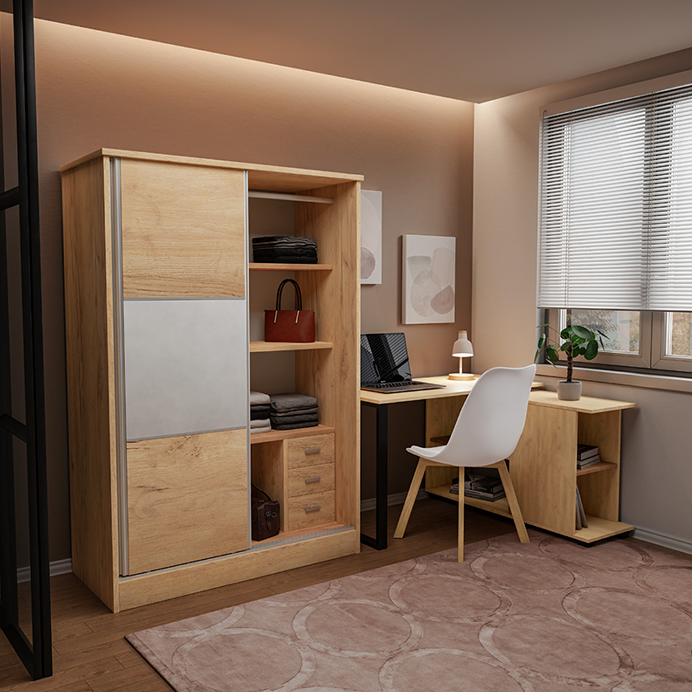 Η δίφυλλη ντουλάπα ρούχων Chase είναι μια εξαιρετική επιλογή για να οργανώσετε τα ρούχα σας με στυλ και λειτουργικότητα. Με συρόμενες πόρτες για μεγαλύτερη εξοικονόμηση χώρου και ποικίλους τρόπους αποθήκευσης προσδίδει μια αίσθηση καθαρότητας, ηρεμίας και οργάνωσης στον χώρο σας. Ανανεώστε τον χώρο σας και απολαύστε την ευκολία και την λειτουργικότητα που προσφέρει και αποκτήστε μια καλά διαμορφωμένη και ευχάριστη ατμόσφαιρα στον χώρο σας.
