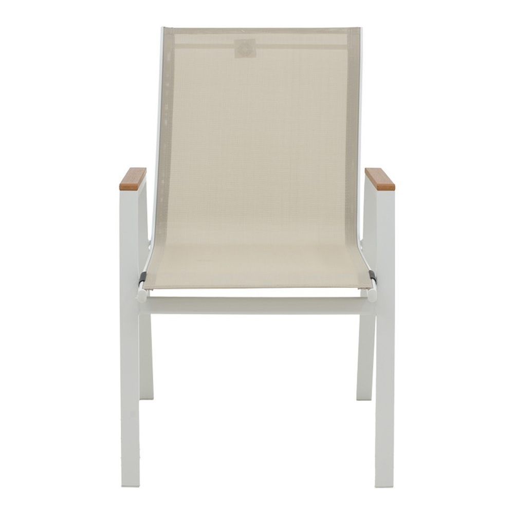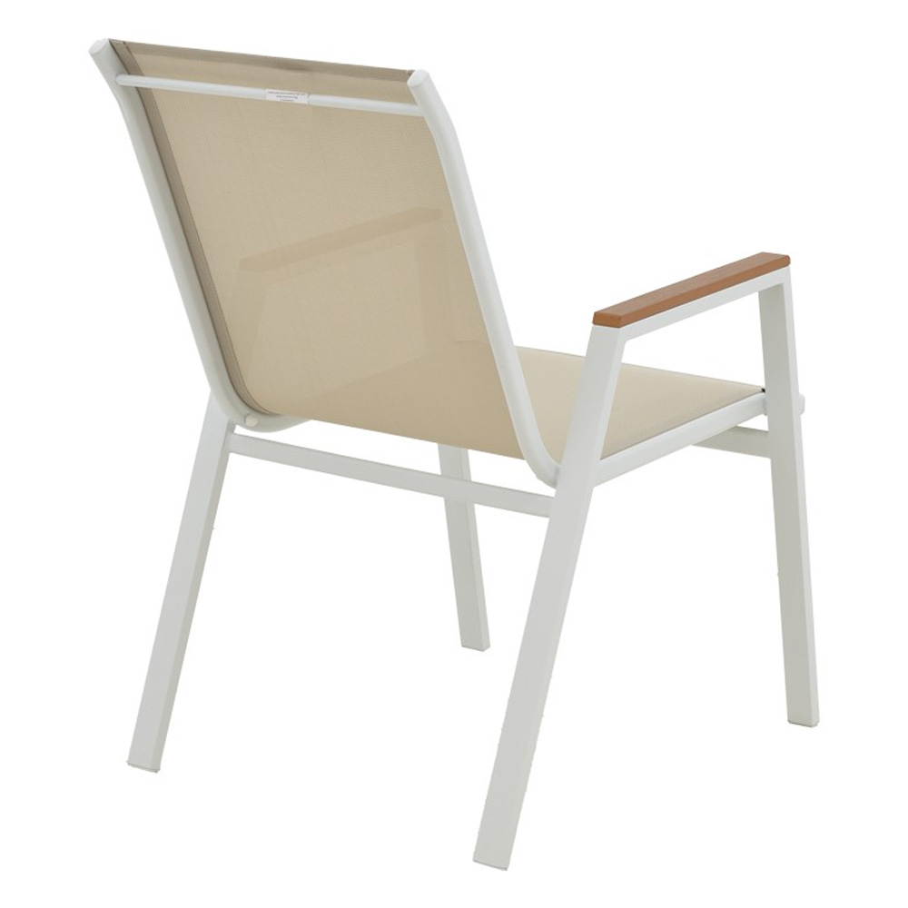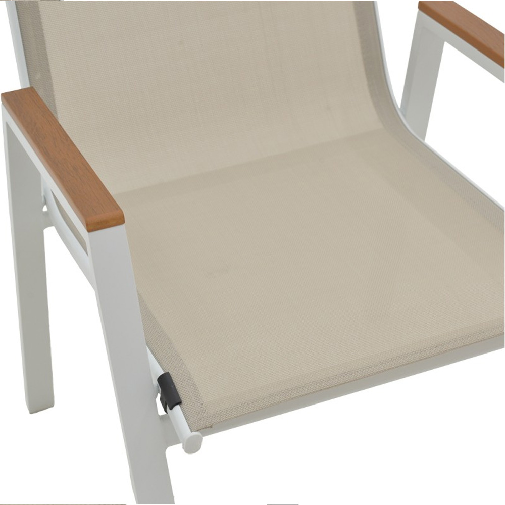 Textilene: Το textilene είναι ένα εξαιρετικά ανθεκτικό υλικό που χρησιμοποιείται ευρέως σε επίπλωση εξωτερικών χώρων και εξαρτήματα. Αποτελείται από πολυεστερικές ινώδεις που επικαλύπτονται με PVC (πολυβινυλοχλωρίδιο), δημιουργώντας ένα υλικό που συνδυάζει ανθεκτικότητα, αντοχή στις καιρικές συνθήκες και εύκαμπτη υφή. Το υλικό αυτό επιτρέπει τη διέλευση του αέρα, βοηθώντας στη διατήρηση μιας δροσερής αίσθησης κατά τη χρήση.