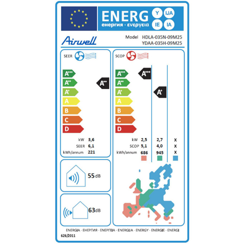 Το κλιματιστικό Aura HDLA-035N-09M25 / YDAA-035H-09M25 της εταιρείας Airwell, έχει ισχύ 12000 BTU και είναι κατάλληλο για χώρους από 18m² έως 25m².