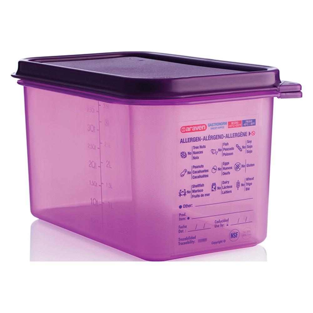 Δοχείο αποθήκευσης τροφίμων Allergen από πολυπροπυλένιο GN1/4 με ύψος 15εκ σε ζωηρό μωβ χρώμα για να αποθηκεύετε και να αρχειοθετείτε εύκολα τρόφιμα. Ένα χρήσιμο και ασφαλές σκεύος για να να οργανώνετε την κουζίνα σας. Ολοκληρώστε τη συλλογή σας με τα υπόλοιπα μεγέθη των δοχείων της σειράς. Κατάλληλο και για καταστήματα εστίασης.