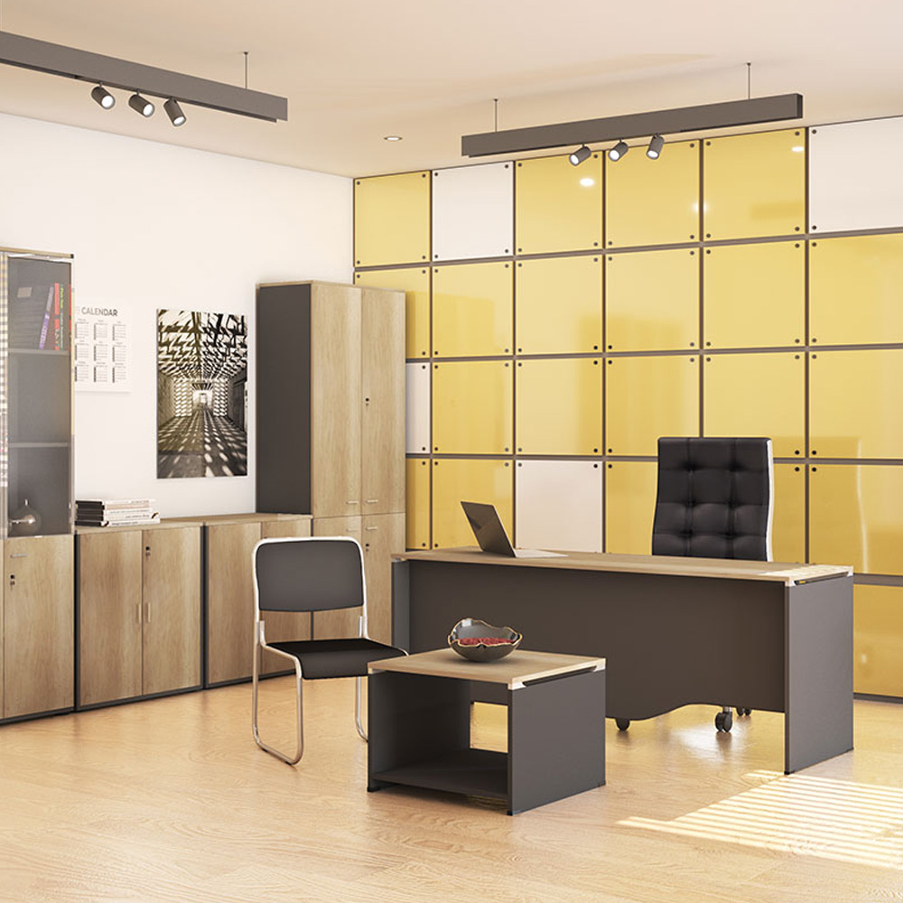 Συνδυάζεται αρμονικά με τα υπόλοιπα είδη της σειράς: Βιβλιοθήκες, ντουλάπια, γραφεία και τραπεζάκι επισκέπτη.