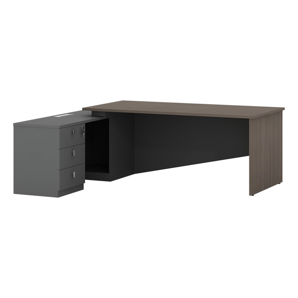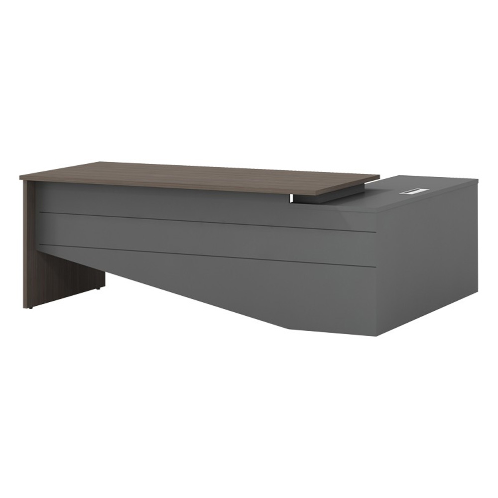 Γραφείο διεύθυνσης με ενσωματωμένο γωνιακό ερμάριο (στην αριστερή πλευρά), στον εντυπωσιακό χρωματισμό του καρυδί – ανθρακί. Κατασκευασμένο από υλικά υψηλών προδιαγραφών και σύμφωνα με τις εργονομικές απαιτήσεις του σήμερα.