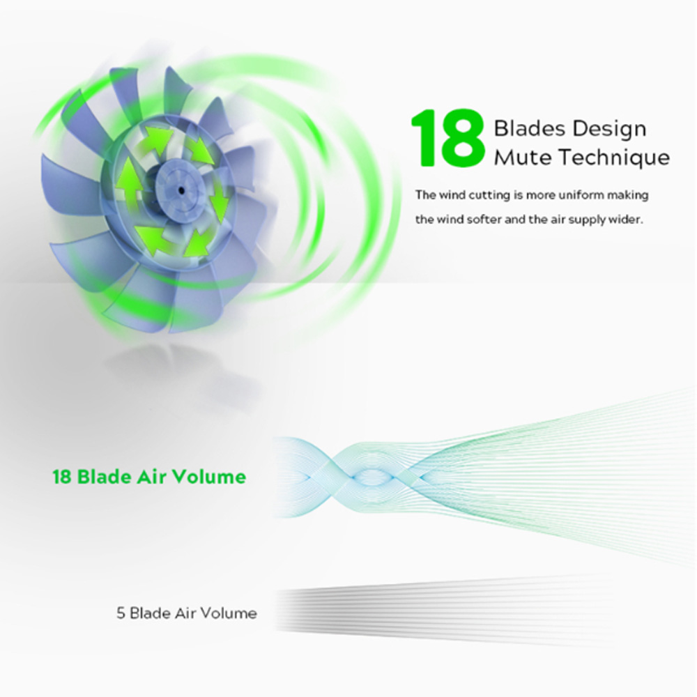 Η 18-φτερη φτερωτή σε συνδυασμό με το πραγματικά μεγάλο άνοιγμα 90ο κατά την περιστροφή, καταφέρνει μεγαλύτερη απόδοση στην κατανομή του αέρα στον χώρο σε σχέση με τα συμβατικά μοντέλα, και σε συνδυασμό με την λειτουργία “FEEL” , δημιουργεί ένα φυσικό ρεύμα αέρα βασισμένο πάνω σε βιονικό μοτίβο , ώστε να δίνει την αίσθηση του φυσικού άνεμου.